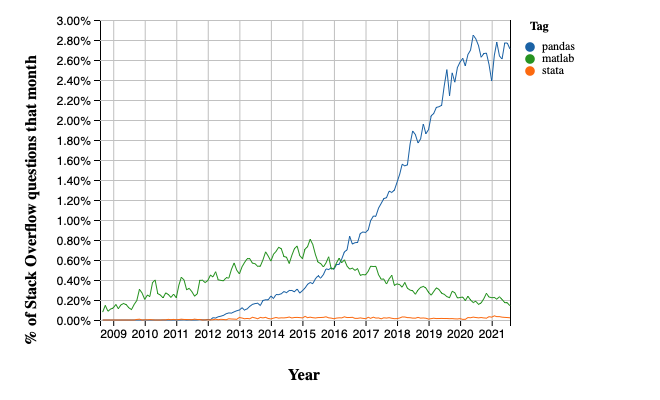 Here’s a popularity comparison over time against Matlab and STATA courtesy of Stack Overflow Trends